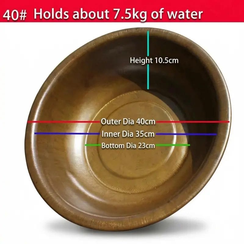 Extra-large 40cm brass foot soak basin with 10.5cm height and 7.5kg water capacity for therapeutic treatments.