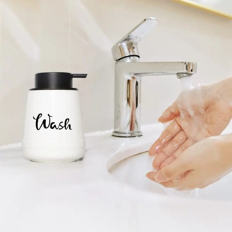 Luxury Dispenser Bottles (14oz) for bathroom & kitchen. Ceramic, non-toxic, and reusable with an easy-to-press pump. Farmhouse elegance.