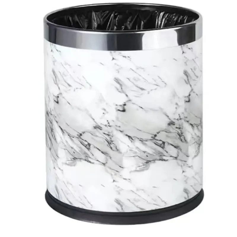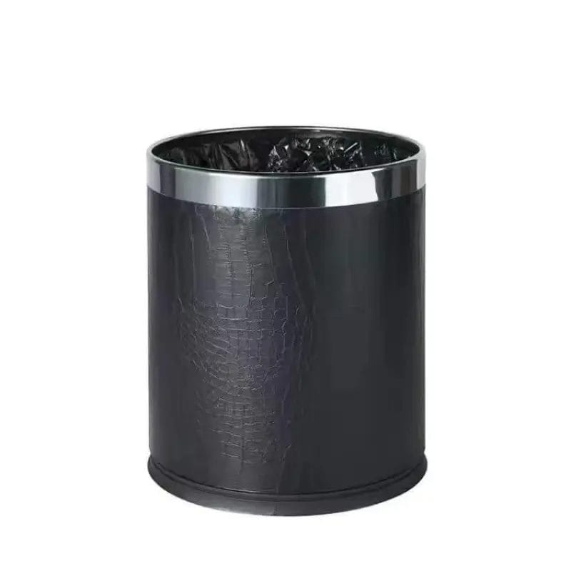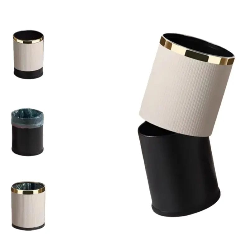 • Premium Material: The main material is high quality leather (PU). This synthetic leather provides a sophisticated, luxurious feel, is easy to clean, and resists scuffs better than many painted metals, ensuring the bin maintains its elegant look over time.
