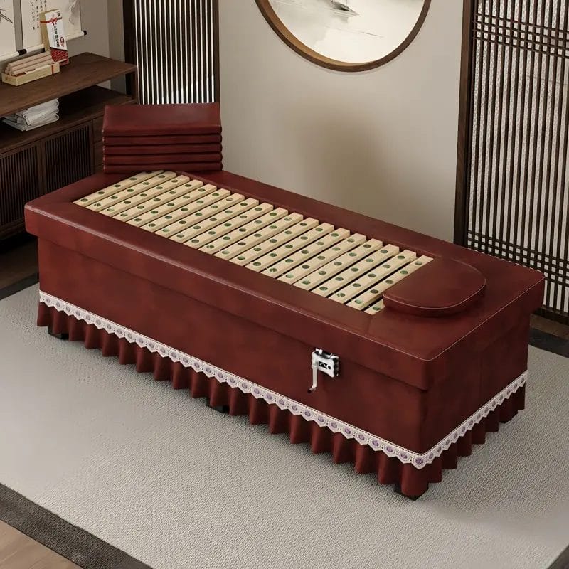 Equipped with an intelligent, brand-name steamer, the bed offers a deep-tissue herbal steam experience. The steamer is designed with anti-overflow technology and can be operated via remote control, allowing the therapist to adjust steam intensity without interrupting the session. The steam rises through a grid of finely polished bamboo strips. Bamboo is chosen for its natural thermal properties and resistance to moisture, providing a smooth and comfortable surface for the guest. The steam helps to open pores, allowing herbal nutrients to penetrate the skin, aiding in detoxification and muscle relaxation.