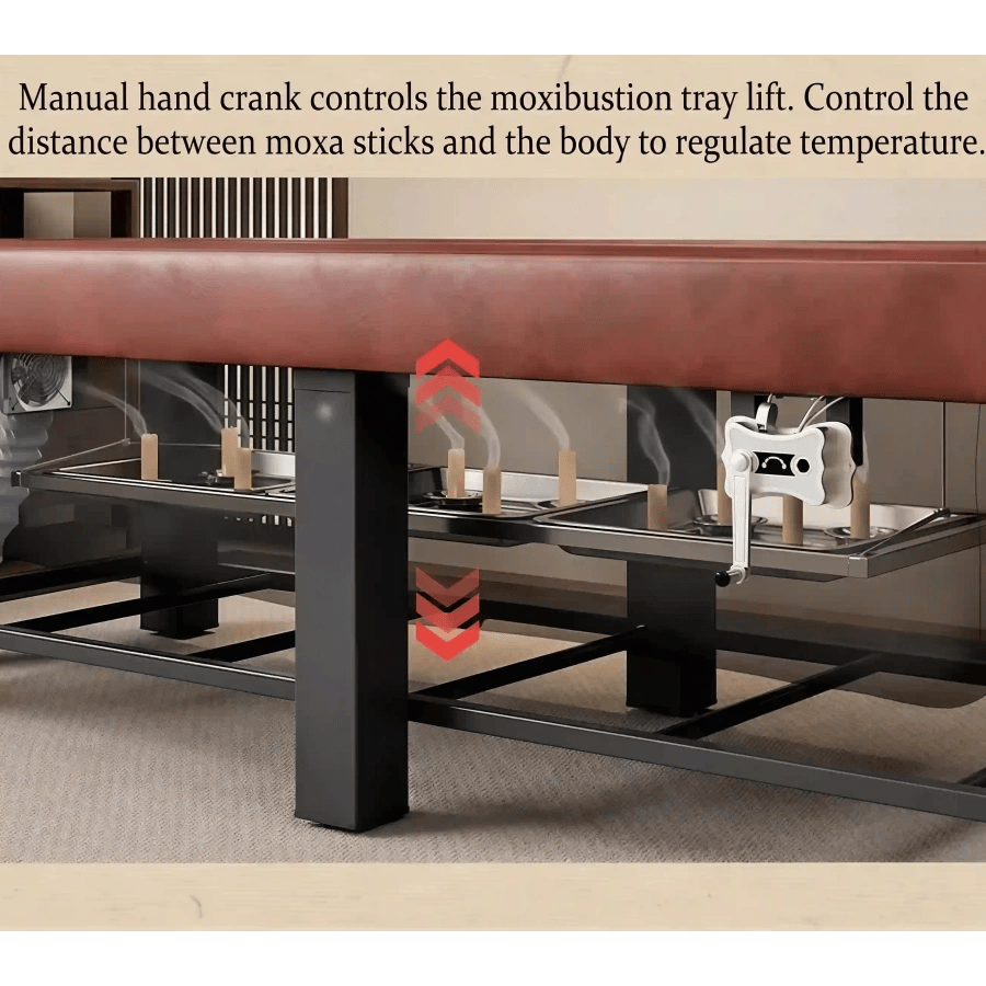 The core innovation of this bed lies in its manual hand-cranked moxibustion tray. Unlike standard fixed-distance beds, our system allows for real-time height adjustment. This is crucial for professional moxibustion therapy, where the intensity of heat must be managed according to the client’s sensitivity. By rotating the ergonomic handle, you can move the moxa tray closer for intense thermal stimulation or further away for a gentle, relaxing warmth. This level of control is essential for preventing burns while ensuring the “Qi” or energy flow is properly stimulated, making it a favorite for professional therapists.